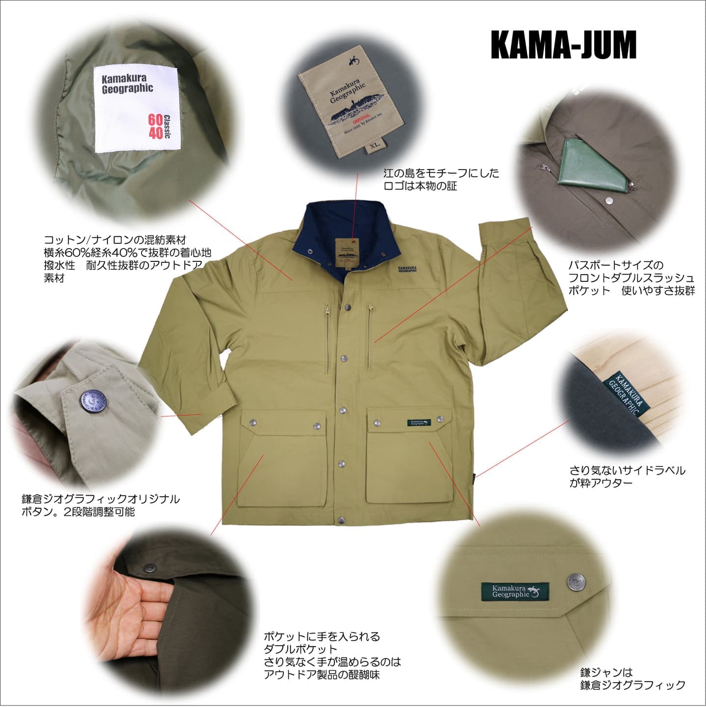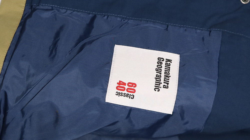 鎌ジャン どこの街を歩いてもそれなりに映る 日常生活を重ねる時に重要なディテールを凝縮した鎌ジャンボディー。横糸コットン60%に40%の縦糸ナイロンを使用。コットンのテイストとナイロンの強度を持ち合わせたブレンド素材。雨に濡れるとコットン素材が膨張して密度が増し 撥水性が向上する 自然が持つ特色を入れた鎌倉ジオグラフィックオリジナルジャケット。